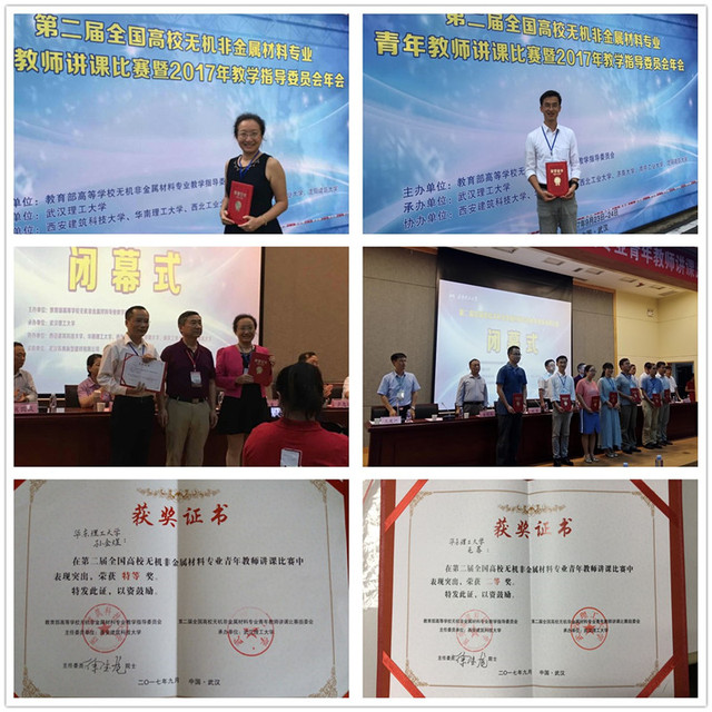 无机系无机非金属材料工程专业的青年教师在此次全国授课大赛中斩获佳绩。孙金煜老师和毛荐老师分获此次大赛的特等奖和二等奖。