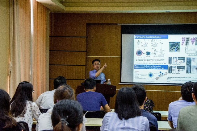 报告中,教授首先介绍了他们课题组在螺旋多肽设计方向的工作。教授课题组致力于精确调节多肽的螺旋性及氨基酸聚合物合成,并设计出了一种具有优异细胞膜活性的螺旋带电多肽,该多肽可广泛用于药物或基因的递送、细胞膜渗透和抗菌药物设计。Cheng教授同时介绍了他们在体内癌症靶向方面工作,他们制备出一种可以标记乳腺癌细胞的叠氮糖衍生物,可在体内成功靶向癌细胞,对癌症的诊断、治疗和生物化学的基础研究都具有重要意义。