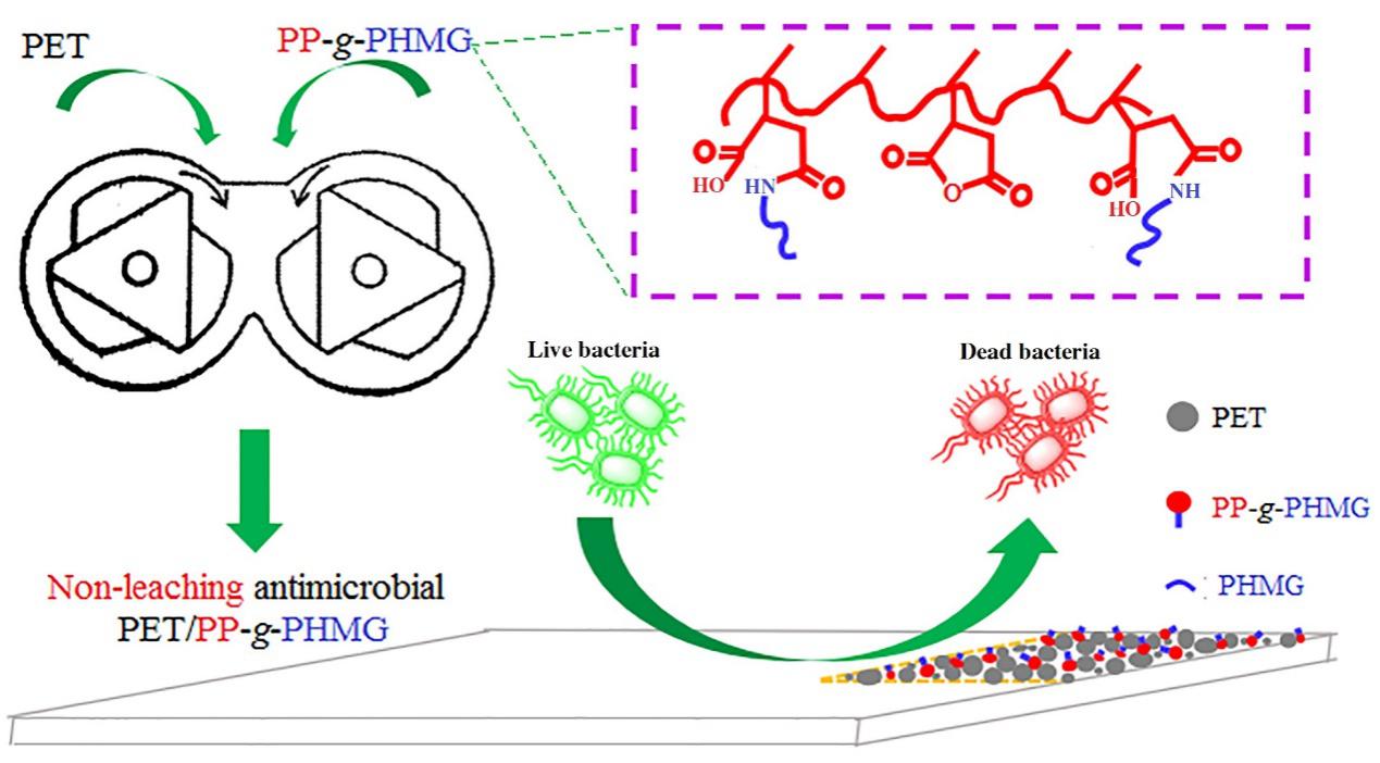 针对这一挑战,课题组运用聚合物反应加工技术,首先将具有高效广谱抗微生物活性的胍盐齐聚物与聚丙烯键合,制备了具有两亲性结构的大分子抗菌母料;进而与PET熔融共混,通过大分子抗菌母料的官能团与PET端基的原位反应,实现将聚丙烯抗菌母料在线结合于PET分子链的末端,克服抗菌组分的溶出问题;又通过聚丙烯的低表面张力,带动抗菌组分富集在PET制品表面,从而高效发挥抗菌功能,成功制备了非溶出的、抗菌性能优异的、力学性能同时得到提高的PET制品。该工作由硕士研究生曹伟在危大福和管涌的指导下完成,并得到了郑安呐教授的悉心指导。研究成果发表于Elsevier旗下的European Polymer Journal,2019,118:231-238。
