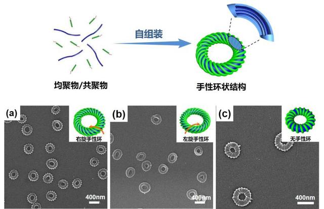 林嘉平教授团队在手性环状纳米结构的制备上取得了新发现。研究发现,聚(γ-苄基-L-谷氨酸酯)(PBLG)均聚物与聚(γ-苄基-L-谷氨酸酯)-嵌段-聚乙二醇(PBLG-b-PEG)嵌段共聚物二元体系在溶液中自组装形成尺寸均匀、手性可控的螺旋环状多级纳米结构。通过调控嵌段共聚物与均聚物的共混比例,发现环状结构是由均聚物组装形成的。进一步的研究表明,该手性环的形成是一个连续的两步自组装过程:首先聚肽均聚物自组装形成均匀的环状结构,然后嵌段共聚物在均聚物环上自组装形成具有手性螺旋的表面纳米结构。值得注意的是,PBLG-b-PEG/PBLG体系自组装形成的手性环表面的螺旋都是右旋手性的(图a)。使用具有相反手性聚肽嵌段的PBDG-b-PEG进行自组装,也可以得到手性环,但是表面螺纹都是左旋手性的(图b);而如果将PBDG-b-PEG和PBLG-b-PEG两种嵌段共聚物与PBLG均聚物共混自组装则可以得到无手性的、具有算珠状表面的环状组装体(图c)。研究工作首次报道了在纳米尺度构筑具有手性的环状多级结构,进一步加深了对曲面受限自组装、以及曲面手性调控规律的认识,并为构筑各类复杂多级纳米结构提供参考。