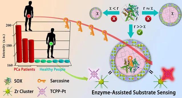 PCa是严重影响男性健康的最常见癌症之一。对于大多数患者来说,在早期阶段没有明显的临床症状,因此PCa的早期筛查对于改善患者的生活质量和降低其死亡率至关重要。肌氨酸被证实为早期PCa的临床标志物,通过对尿液中的肌氨酸水平进行检测可完成简单和无创的早期PCa诊断。然而,在PCa的病理过程中,人类尿液中的肌氨酸含量仅增加不到一个数量级。此外,探针通常容易受到临床样本中可能共存的大量生物分子的干扰。因此,很难准确区分肌氨酸的微小浓度变化,从而导致假阳性/阴性诊断的风险。这些问题使得临床样本中肌氨酸的特异检测具有挑战性。