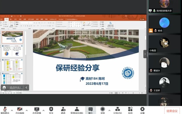 陈珂首先向参会学生介绍了保研政策和总体的情况。随后分享了他保研至复旦大学高分子系的心得。他建议,同学之间可以多分享多交流,也建议向往届保研到自己心仪院校的学长学姐提前了解夏令营情况和面试题型,面试时才能胸有成竹。董涵泳分享了他保研到上海硅酸盐研究所的经验。他建议同学们可以适当紧张,但不要过分担忧,他介绍了上海硅酸盐研究所与高校在科研环境等方面的不同。郭艳宇在2022年考研中以410分综合排名第一的佳绩考研本校材料科学与工程专业。她从考试流程、复试准备、备考详解、心态调整四个方面详细向同学们分享了她的考研历程,用自己的故事鼓励了本科数学学习薄弱的同学建立信心,沉着备考。郑昌昊即将就读于中国科学院上海微系统与信息技术研究所信息功能材料重点实验室,他分享了他选择跨专业读研的心路历程,给依旧迷茫于专业方向选择的同学提供了思路。