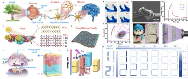 袁双龙课题组提出了一种由直接生长在柔性碳纳米管纤维(CNTF)电极上的高密度TiO2-x和MoS2阵列组成的双扭曲结构的纤维状人工光电突触(FAOS)的设计策略。该FAOS整合了电/光感应能力,实现了多种突触功能,包括受到刺激后电流、短期/长期可塑性以及“学习-遗忘-再学习”行为。所制备的FAOS还显示出良好的灵活性,其光电突触性在弯曲200次后可保持95.95%。由于1D光纤的全向光吸收特性,光线入射角的变化对FAOS的光电突触性能几乎没有影响。作为概念证明,七个FAOS直接编织到商用透气纺织品中,形成光电突触阵列,从而实现了可感知和记忆图像信息的可穿戴织物,展示了其在可穿戴视觉记忆系统中的应用。