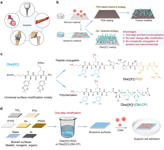 生物活性材料促进细胞黏附和新组织再生,有着重大的临床需求。通过分子修饰促进表面生物活化是生物惰性材料转变为生物活性材料的有效策略。现有的表面修饰方法通常不具有普适性,且存在步骤复杂和条件严苛等问题,而用简单的一步法来实现通用材料表面的活性修饰仍是难题和挑战。刘润辉教授课题组在前期研究中发现了一种受沙堡蠕虫启发的三肽(丁二胺-多巴-赖氨酸-多巴 DbaYKY),可以通过简单的一步修饰水凝胶进行功能化(Nat. Commun.2021, 12 (1), 6331)。这种三肽可以通过液相合成方便地大量制备,并可以引发多种类型的聚合。在此基础上,本文进一步设计合成了DbaYKY三肽端基的细胞黏附ECM多肽RGD和模拟ECM细胞黏附多肽DbaYKY-RGD的β-氨基酸聚合物DbaYKY-(DM-CP),发现这种简单通用修饰方法能够对不同生物材料基材(包括金属、无机和有机材料)进行修饰,仅5分钟即可赋予材料表面促进细胞黏附的功能,实现生物惰性表面向生物活性表面的转变。这一方法在组织工程修复材料和细胞芯片等生物材料领域具有广泛的应用。