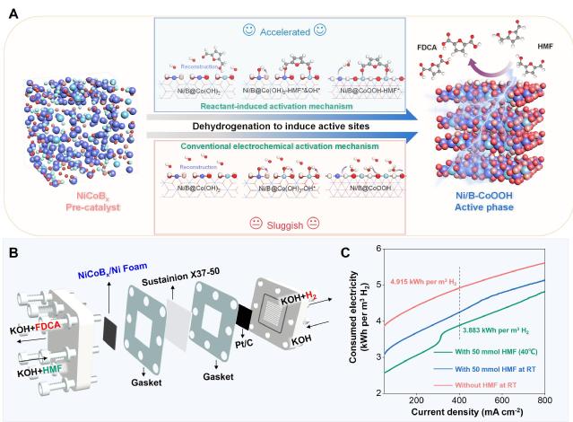 在HMF电氧化过程中,通常采用高电位诱导生成高价态活性金属位点,从而催化HMF氧化,这意味着需要消耗大量的电能来驱动活性物质再生;同时,在高电流密度下,水相体系中反应物HMF与催化剂相互作用关系复杂,HMFOR与OER相互竞争,导致目标产物FDCA的效率较低。针对上述问题,研究团队开发了一种新型非晶态类金属NiCoBx材料用于HMF电氧化,与传统非贵金属催化剂相比,NiCoBx具有在相对较低的电位下选择性氧化HMF的性能。此外,在HMFOR过程中,当NiCoBx结构演化形成活性相时,含有醛基官能团的反应物HMF会优先吸附在催化剂材料表面,加速金属位点的电子转移及脱氢过程,从而促进HMFOR活性相(Ni/B掺杂CoOOH)的原位生成。这种独特的“反应物诱导活化催化剂”机理在提高HMFOR催化活性的同时,可以有效避免OER副反应发生,只需要1.33 V(相对于可逆氢电极)的低电位就能产生200 mA cm-2的高电流密度,并在多个测试循环中保持较高的FDCA产率(93.0%-99.7%)、法拉第效率(92%-95%)和选择性(100%)。