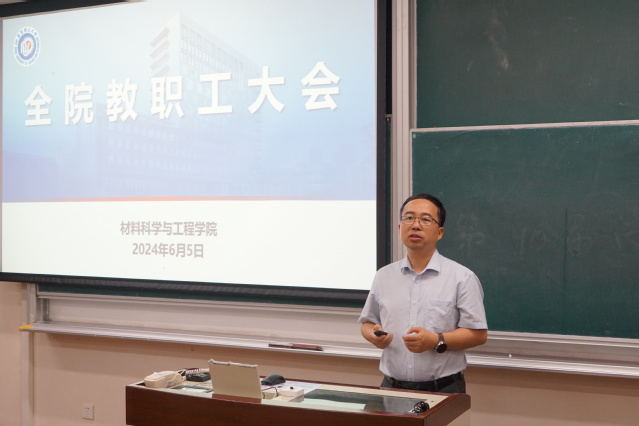 院长杜建忠汇报了学科建设情况、重点建设方向、科研经费等总体概况,从人才培养质量、师资队伍平台、科学研究水平、社会服务声誉等一级指标和思政教育、培养过程、平台资源、科研项目、科研成果与转化等二级指标进行全面对标分析。从全重室筹建、教育部重点实验室建设、电子信息材料新专业建设、国际交流与合作、先进材料大楼建设等方面介绍了本学期的工作重点。他提出,要以面向世界科技前沿、面向经济主战场、面向国家重大需求、面向人民生命健康“四个面向”为指引,深入实施学校“两新两大”战略。他期待全院教职工同心协力,团结奋斗,推动学院中心工作再上新台阶。
