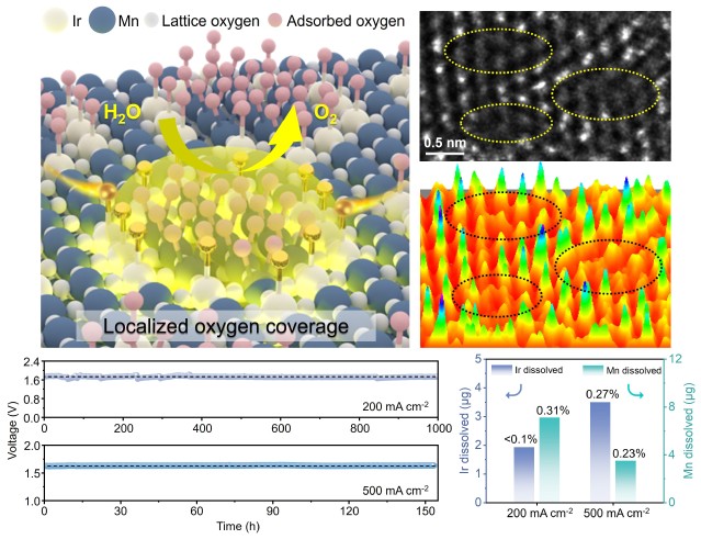 研究团队创新性地开发了一种具有新型Ir原子网格结构的阳极析氧催化剂(Ir-Mn-Ov),通过活性MnO2-x载体担载高密度Ir位点(≈10个Ir原子/nm2),可以诱导氧覆盖度效应进而实现金属-载体位点O-O直接耦合的协同催化过程,显著提高了材料的本征活性和催化剂位点的原子利用率。在三电极测试体系中,这种Ir-Mn-Ov催化剂在10 mA cm-2和500 mA cm-2电流密度下分别仅需166 mV和283 mV的超低过电位,质量活性相比商用IrO2提高了380倍。这种氧覆盖度效应可以很好适配阳极侧富氧环境,在PEMWE器件测试体系中,与商用Ir黑催化剂相比,使用Ir-Mn-Ov催化剂时不仅Ir载量降低了95%,反应活性也得到了大幅提升,只需要1.58 V电解电压即可达到1 A cm-2电流密度。