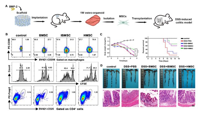 为解决这一问题,研究团队提出了一种新型的“自体MSC原位授权”策略,通过植入负载骨形态发生蛋白2(BMP-2)的生物活性材料在体内构建类骨组织,借助发育早期的炎性微环境来激活MSCs的免疫调节功能。研究表明,该方法所获得的自体MSCs具有更低的免疫原性,有助于其在宿主中的长期存活,且更长时间保持其免疫调节能力。这些优异的免疫调节特性使其在小鼠溃疡性结肠炎的治疗中获得显著的效果,降低死亡率,重塑结肠部位炎症生态位。这种由植入活性材料而产生的自体来源MSC为干细胞治疗提供了一种有前景的全新细胞来源。