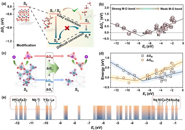 有鉴于此,研究团队开发了一种主动机器学习势函数工作流程,解析了酸性OER中RuO2催化剂表面结构的动态演化过程。研究发现,少量Ru溶解会导致RuO5活性单元的扭曲,从而提升了OER提升活性,但其高电位下会转变为惰性的RuO4单元。基于动态演化结构的解析,为了增强高活性结构的电压容忍性,防止其过度演化,文章利用掺杂工程,理论发现了一种“倒火山型曲线”的改性规则,提出了Na、Ta等元素对RuO2催化剂稳定性及活性的提升作用,为实验上设计高效稳定的RuO2基催化剂及解析实验上不同掺杂金属稳定RuO2催化剂作用提供了统一理论框架。基于理论结果,团队通过熔盐法定向合成了Na掺杂RuO2催化剂,验证了“倒火山型曲线”的有效性,在10 mA cm-2电位测试下能运行超过1800 h,并在PEM水电解槽中稳定运行,展现出良好的应用潜力。这项理论工作增进了对酸性OER中RuO2催化剂原位结构演变的认知,为高效、稳定的RuO2基催化剂设计提供了理论基础。