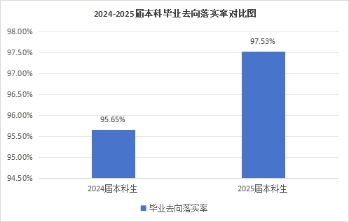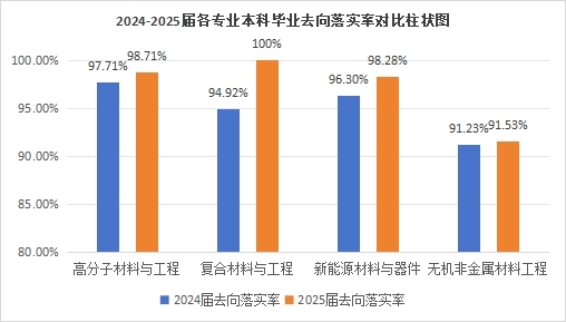 2025届本科生总体毕业去向落实率达97.53%,其中高分子材料与工程专业98.71%,复合材料与工程100%,新能源材料与器件98.28%,无机非金属材料工程91.53%,各专业数据同比2024届本科毕业生均有显著提升。
